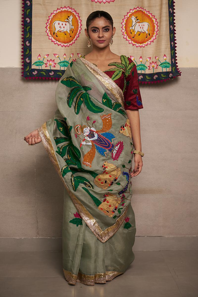 A graceful grey organza saree adorned with intricate patchwork detailing, paired with a complementing blouse. Light, festive, and refined—perfect for celebrations with subtle Pichwai-inspired artistry.