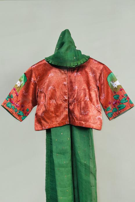 Presenting Pichwai art-inspired embroideries on linen & organza blouse. This is a masterpiece, meticulously adorned with intricate motifs and vibrant colors perfect for adding a touch of sophistication to any saree.