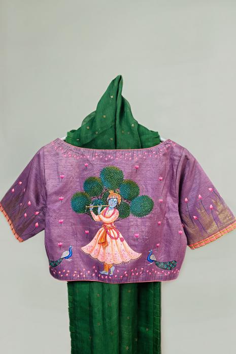 Presenting Pichwai art-inspired embroideries on luxurious ghicha blouses. This is a masterpiece, meticulously adorned with intricate motifs and vibrant colors perfect for adding a touch of sophistication to any saree.