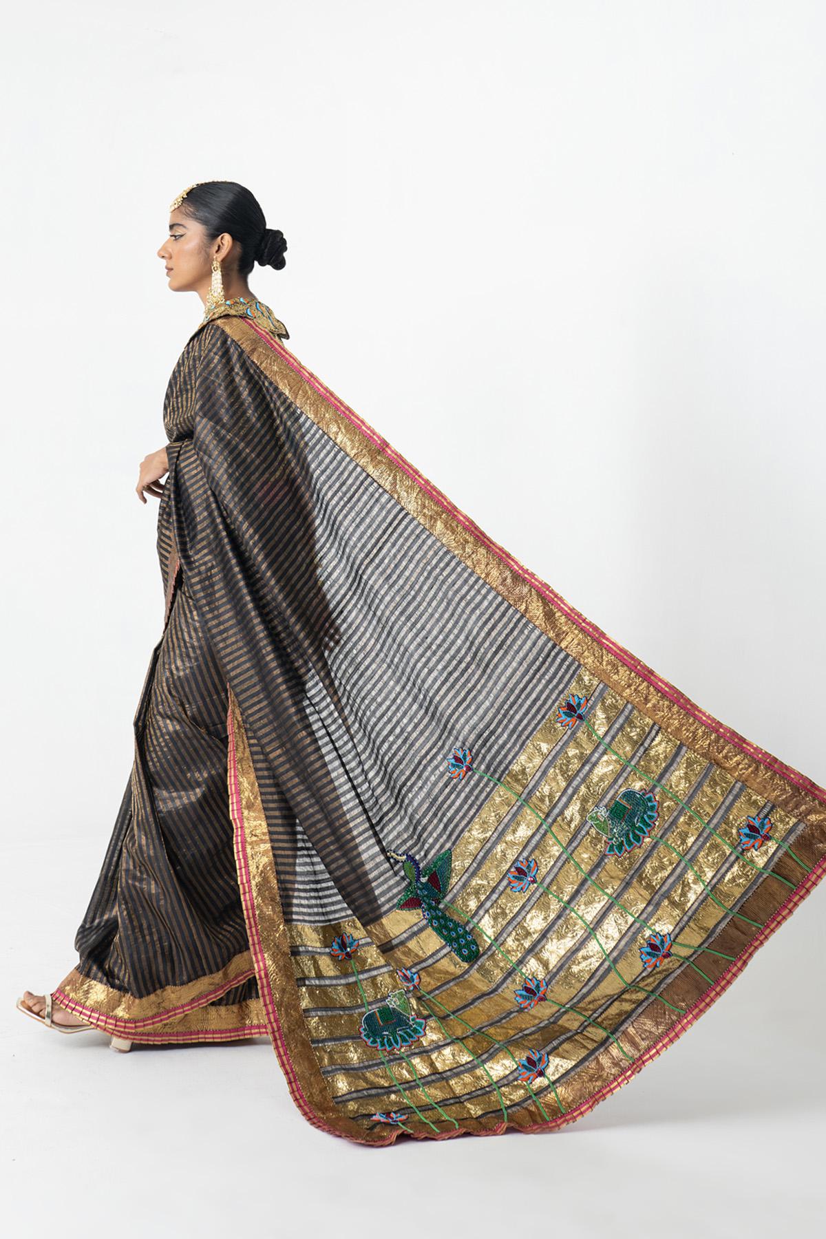 Hand Embroidered Tussar & Gota Pichwai Saree with an Embroidered Gota stitched Blouse.