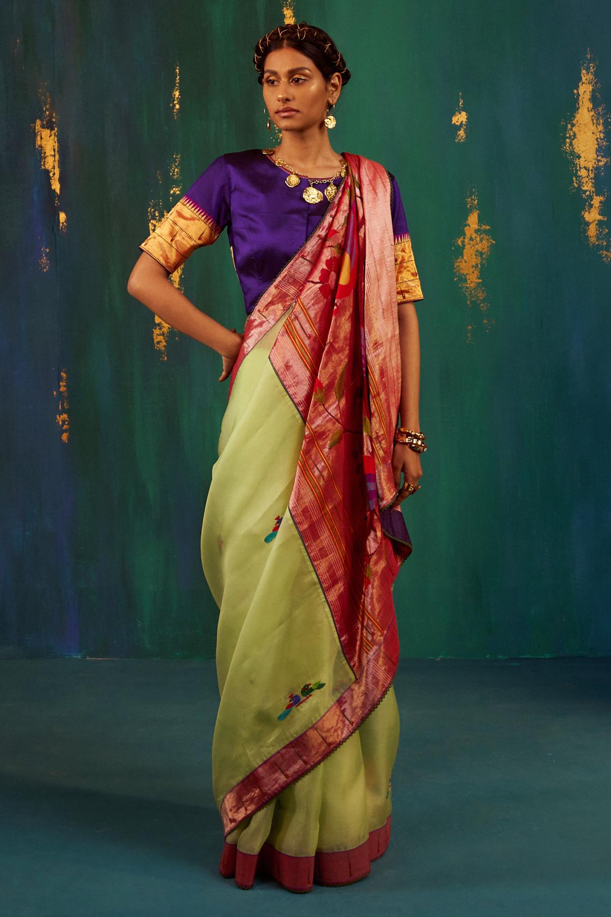 Label Pratham's Pichwai saree is a classic representation of wearable art. It's a fusion creation that blends India's Paithani weave with the interpretive embroidery of craftsmen. This saree is a must-have for any connoisseur of art and craft.