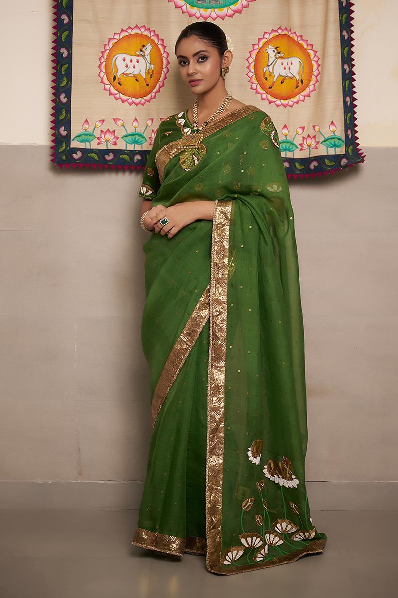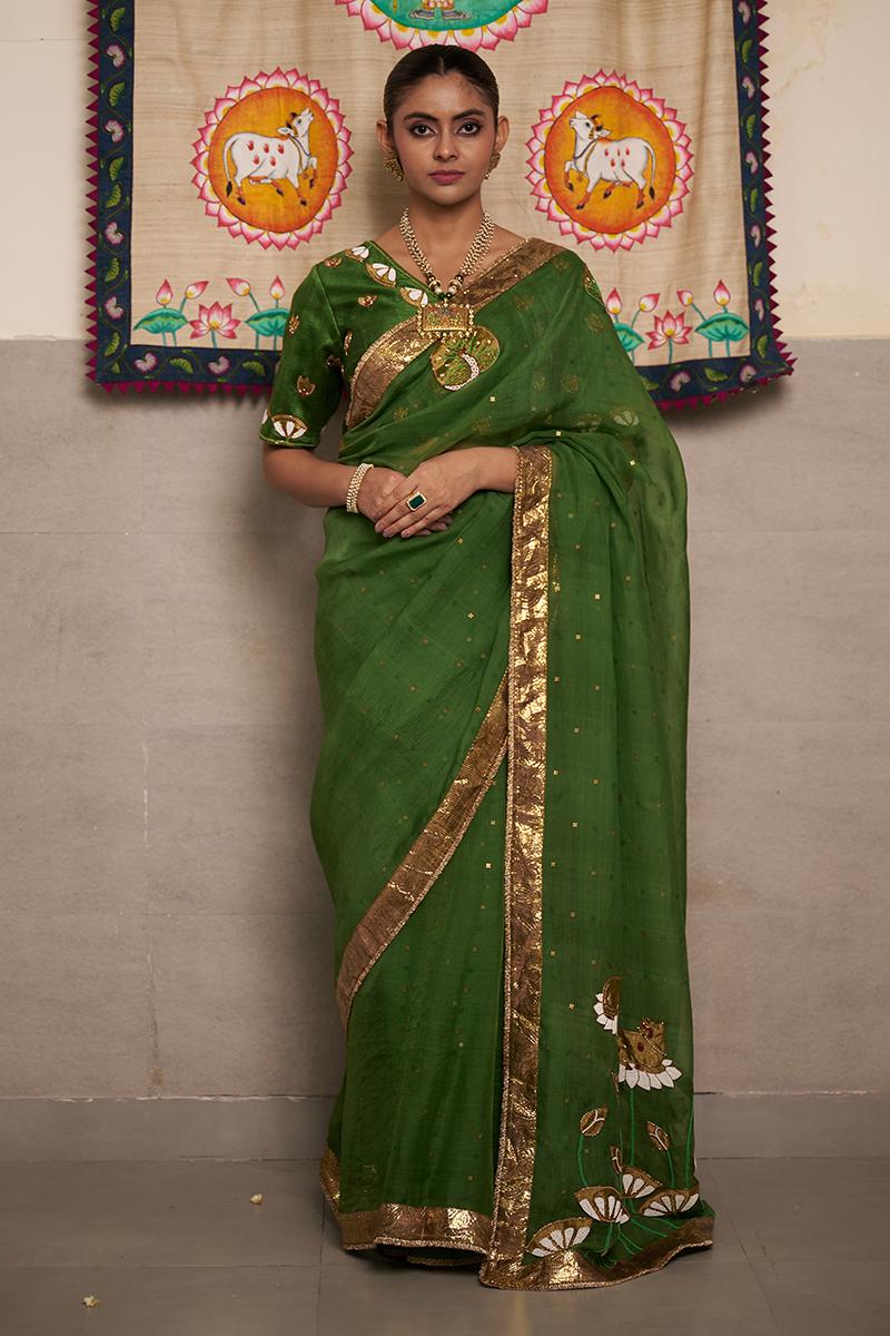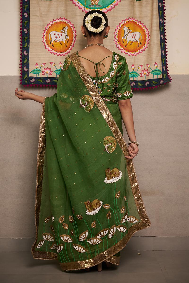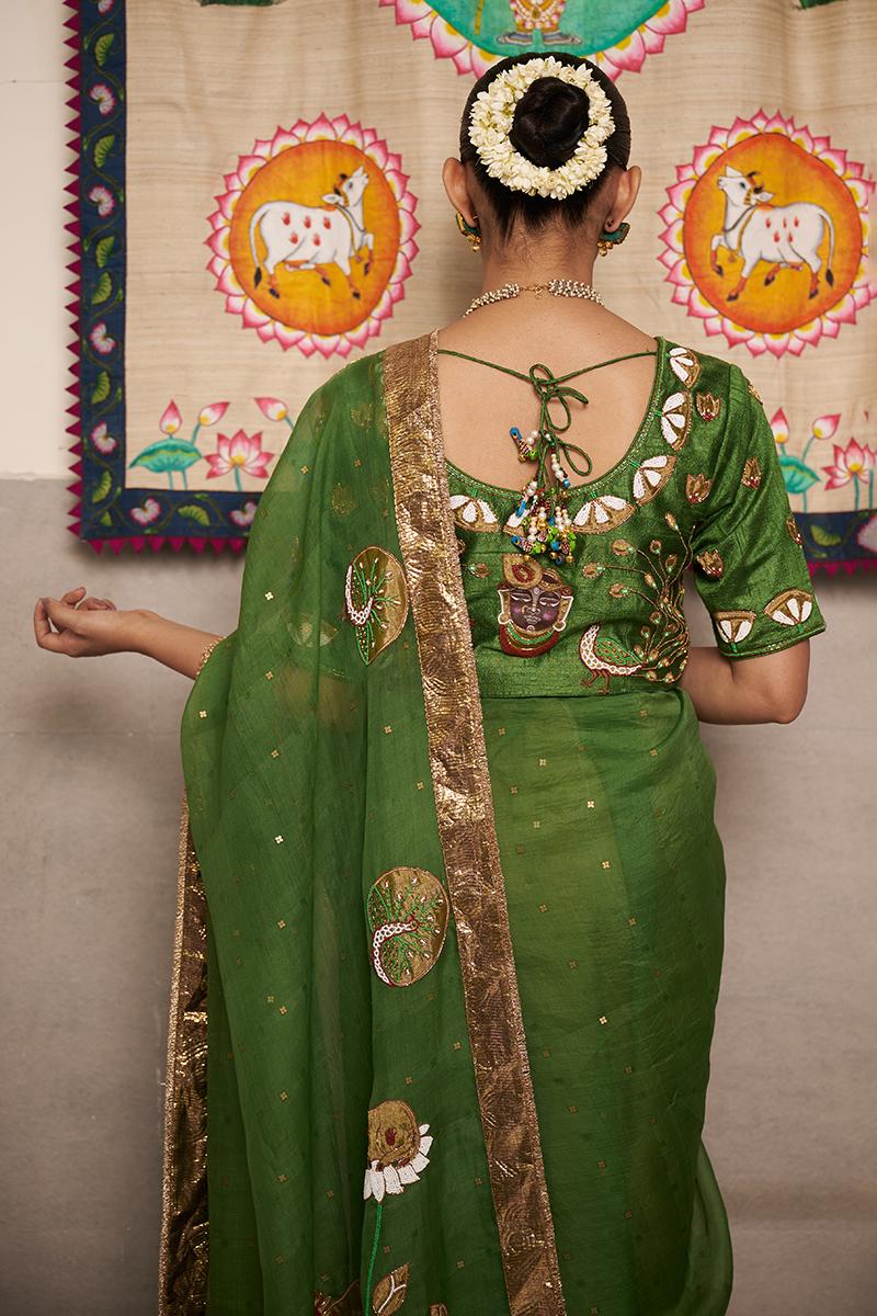 A rich dark green organza saree embellished with fine hand-embroidered Pichwai motifs. Comes with a coordinated hand-embroidered blouse, making it perfect for festive elegance.