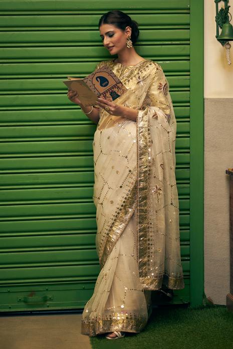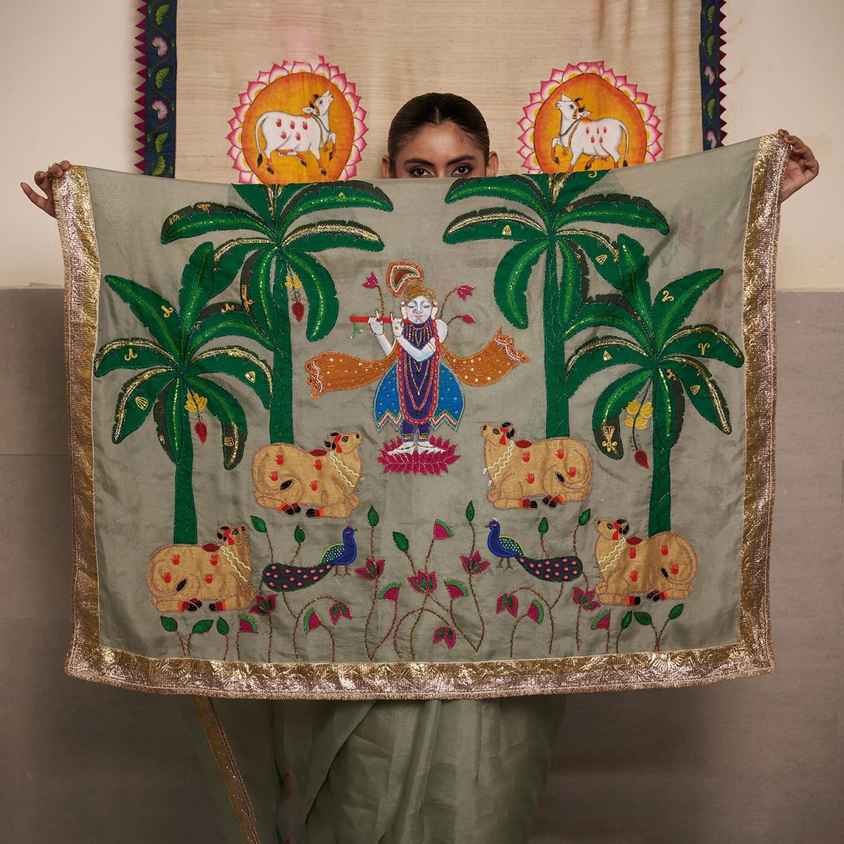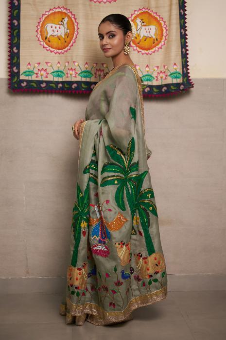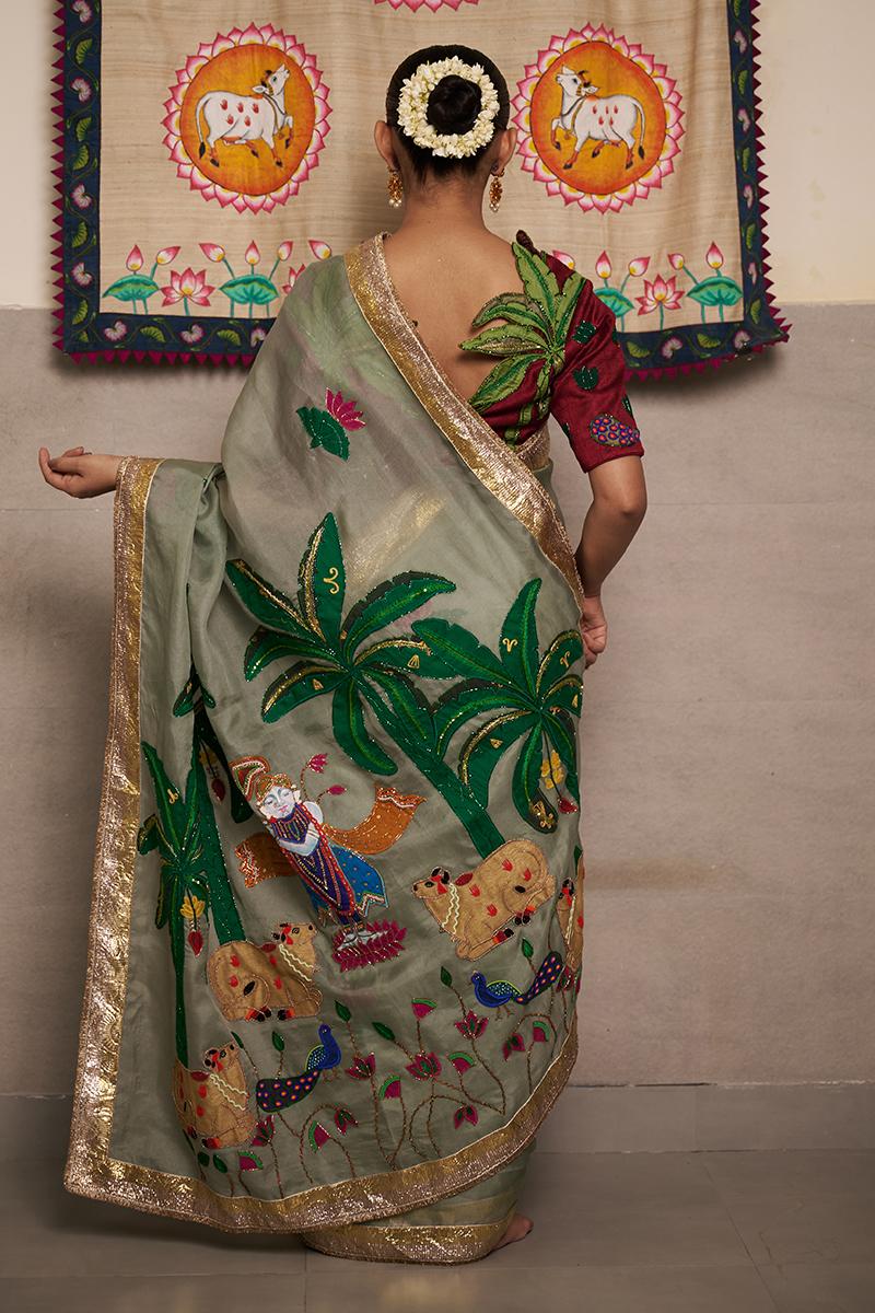 A graceful grey organza saree adorned with intricate patchwork detailing, paired with a complementing blouse. Light, festive, and refined—perfect for celebrations with subtle Pichwai-inspired artistry.