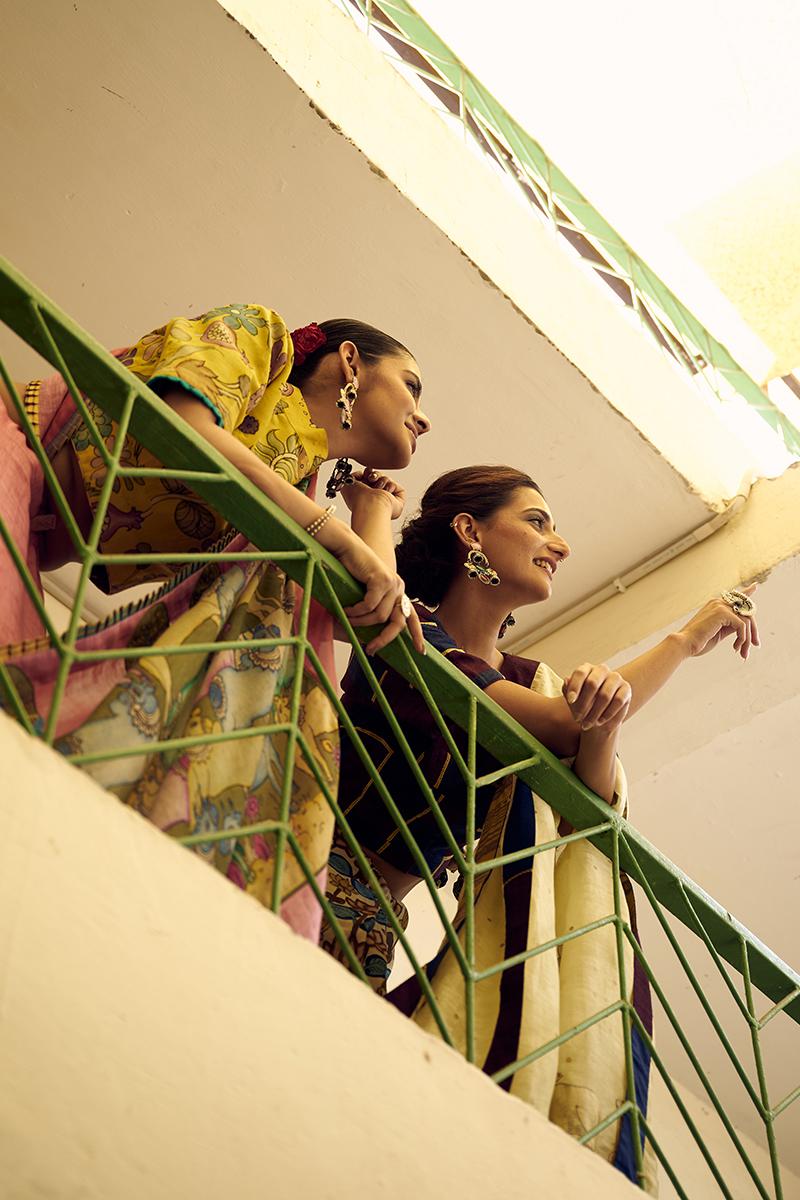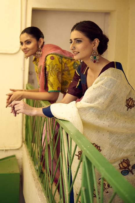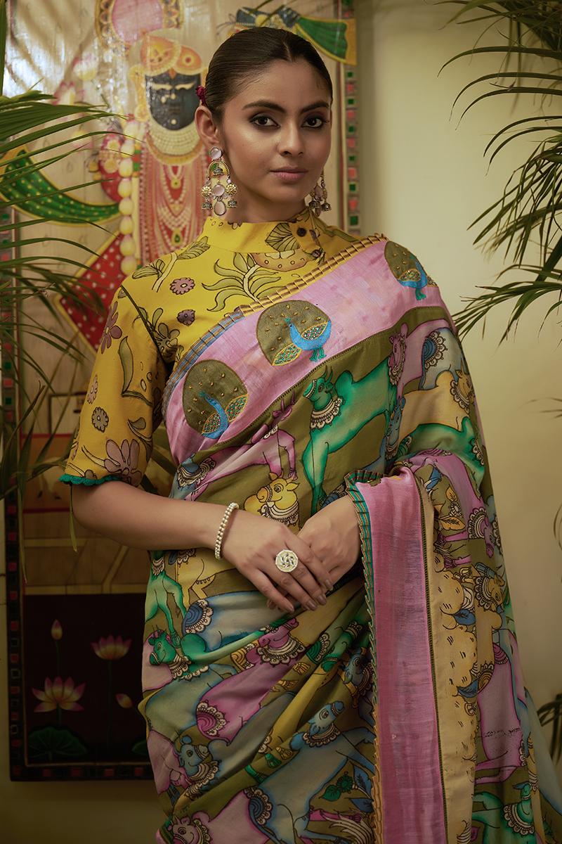 A sublime pink saree crafted in organza and silk, featuring a fusion of Kalamkari artistry and intricate hand embroidery. Paired with a matching Kalamkari blouse, this festive piece beautifully blends tradition with contemporary finesse.
