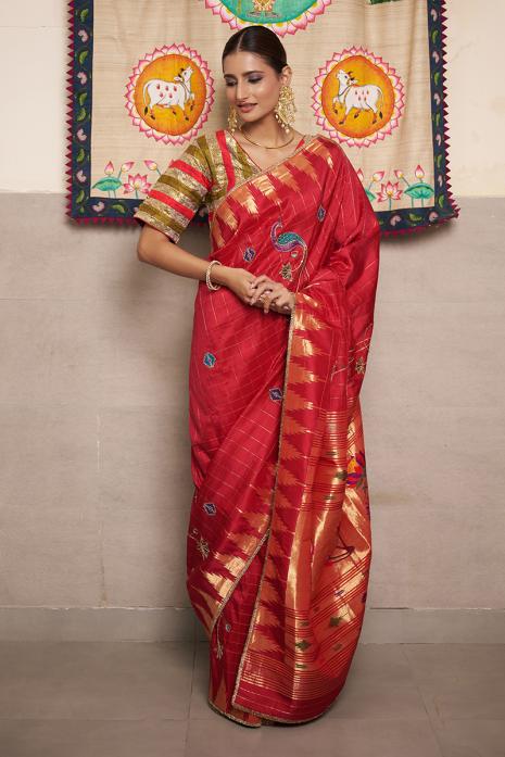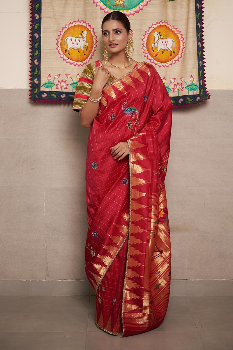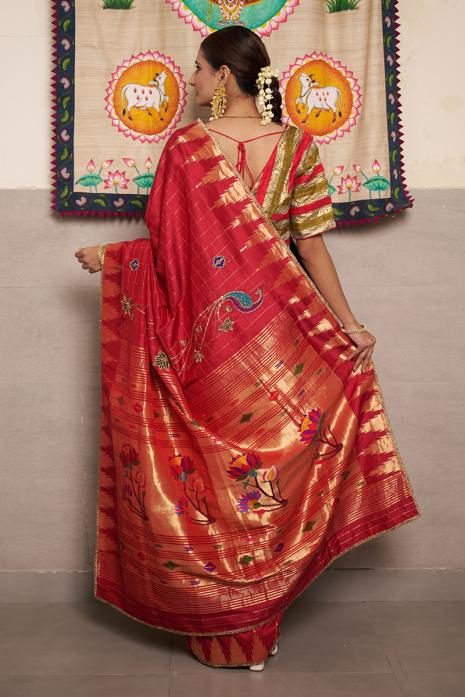 A blush-pink Paithani silk saree, hand-woven and adorned with delicate hand-embroidered Pichwai motifs. Paired with a matching blouse, this festive ensemble blends tradition and luxury in every intricate detail.