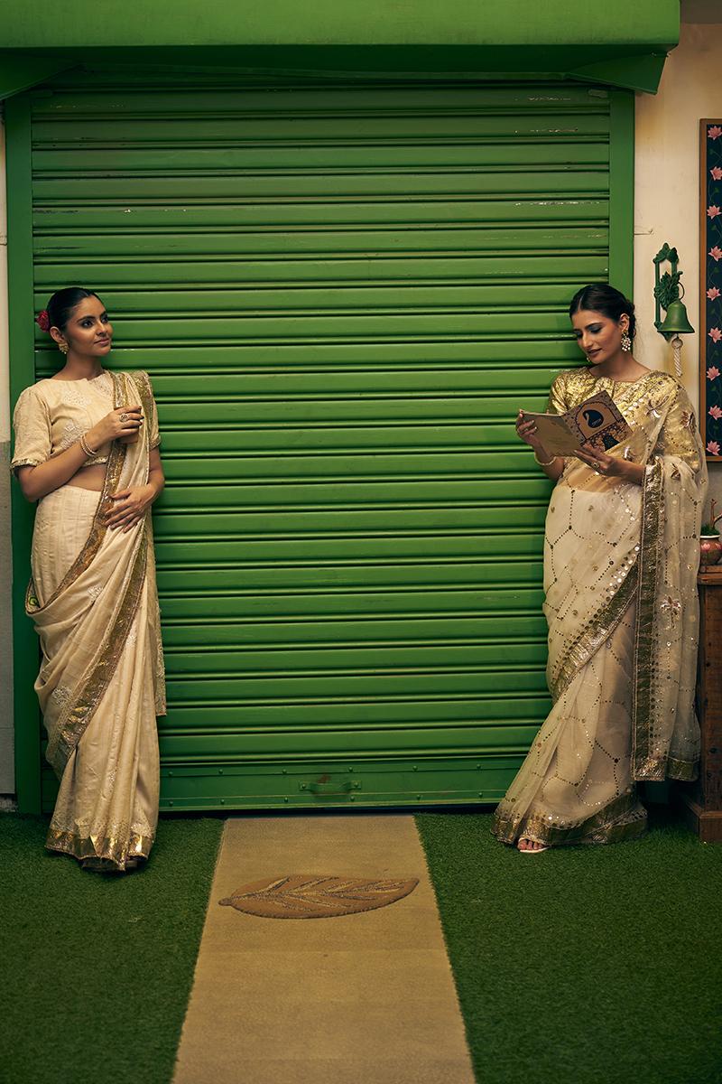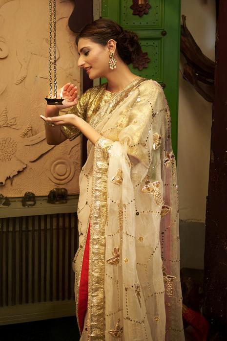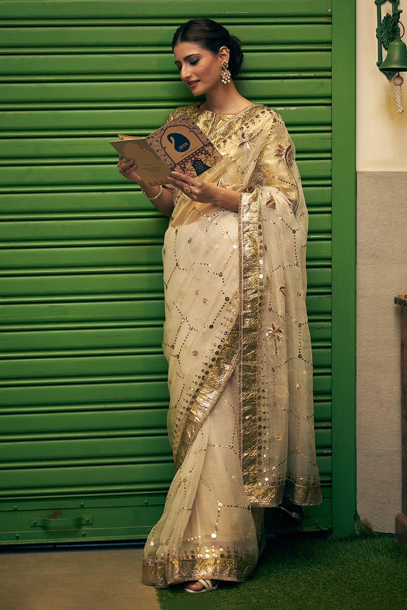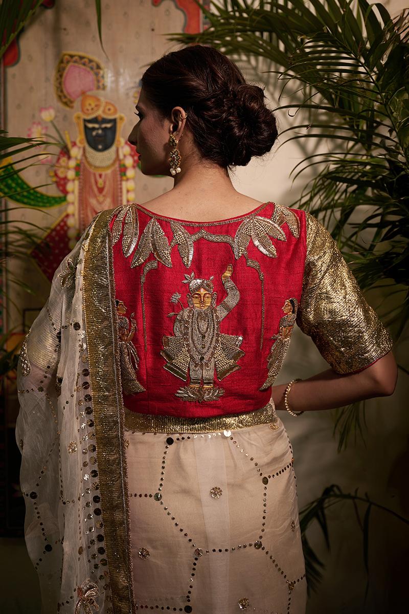 A serene white organza saree featuring hand-embroidered Chikankari details blended with delicate Pichwai motifs. Paired with a matching embroidered blouse, this festive piece embodies pure grace and craftsmanship.
