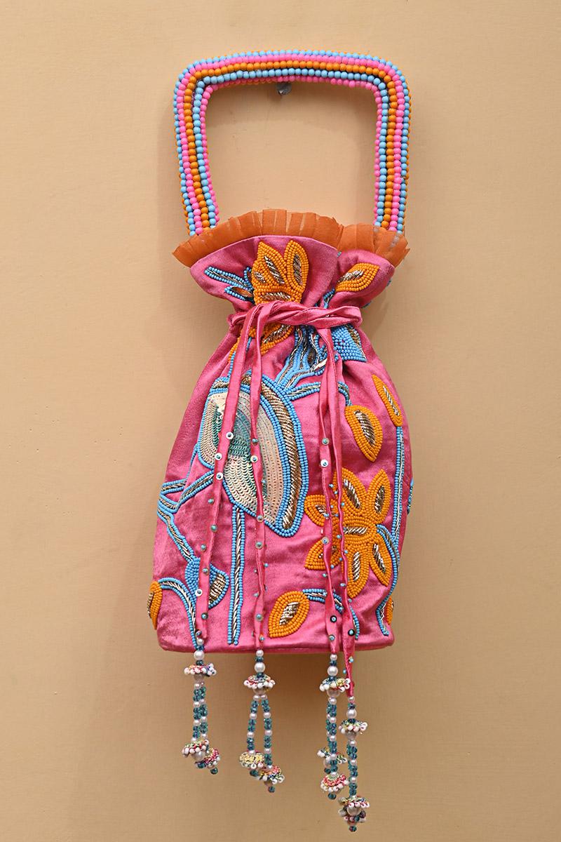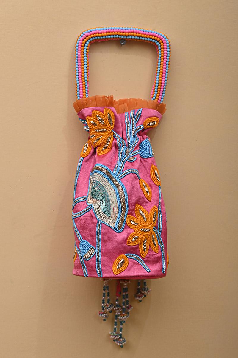 Hand Embroidered Potli inspired by Pichwai art on Mushroo fabric