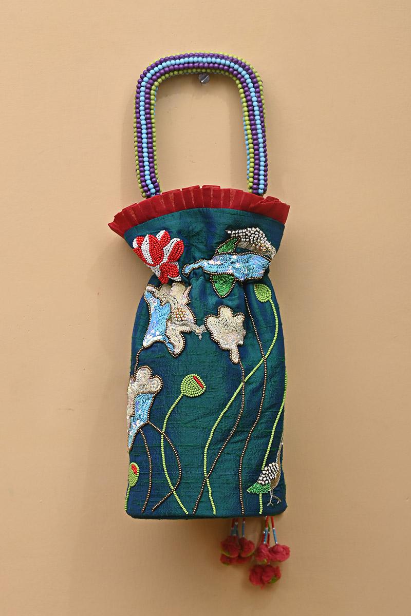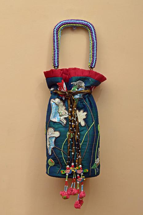 Hand Embroidered Potli inspired by Pichwai art on Mushroo fabric