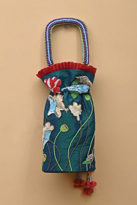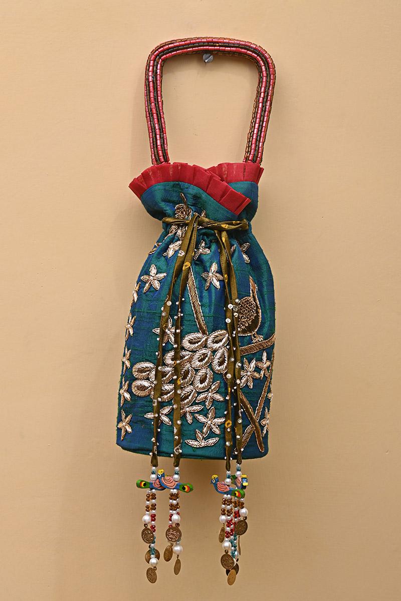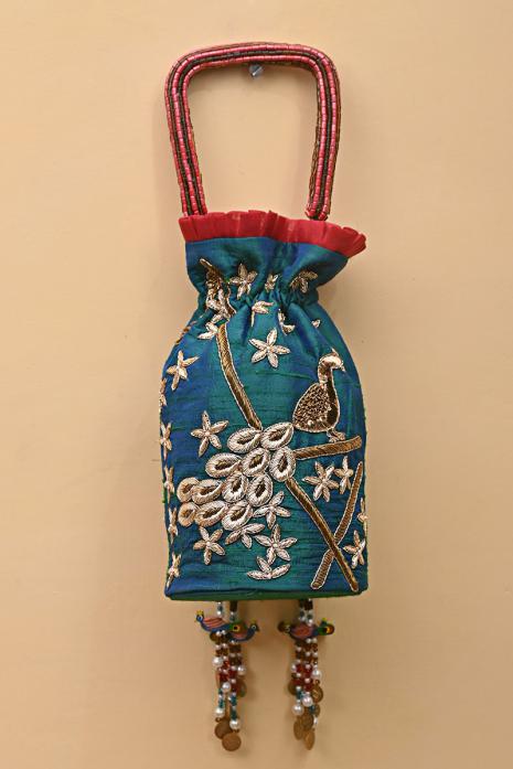 Hand Embroidered Potli Inspired by Pichwai art on raw silk fabric