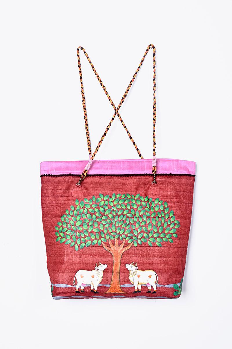 Hand Painted Tote bag inspired by Pichwai art on ghicha silk fabric.