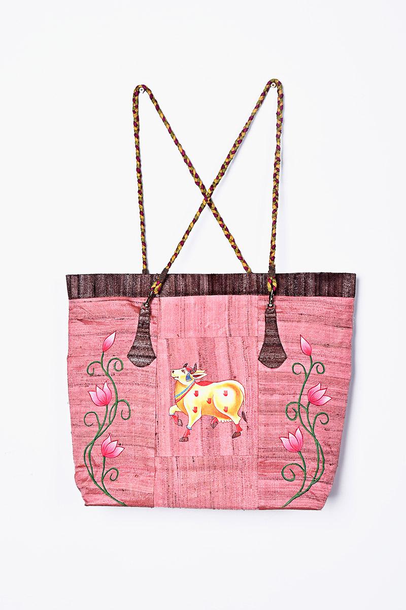Hand Painted Tote bag inspired by Pichwai art on ghicha silk fabric.