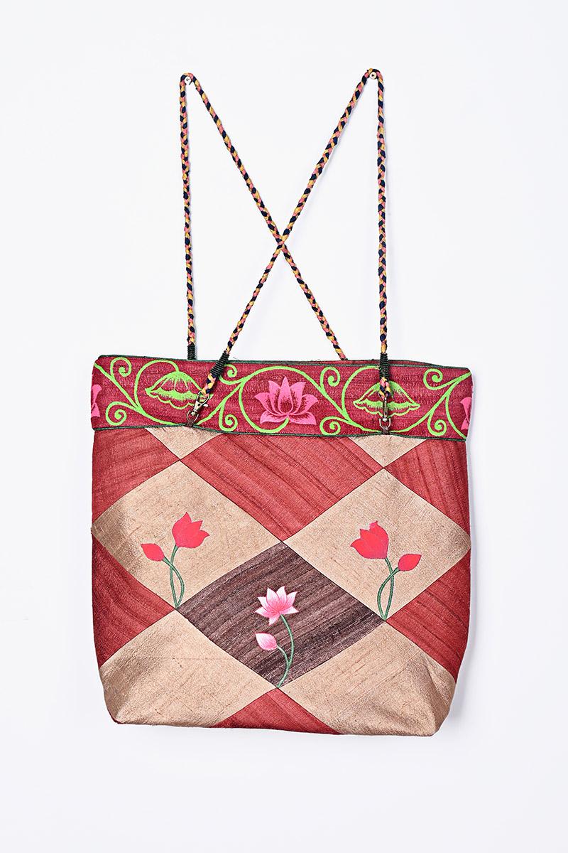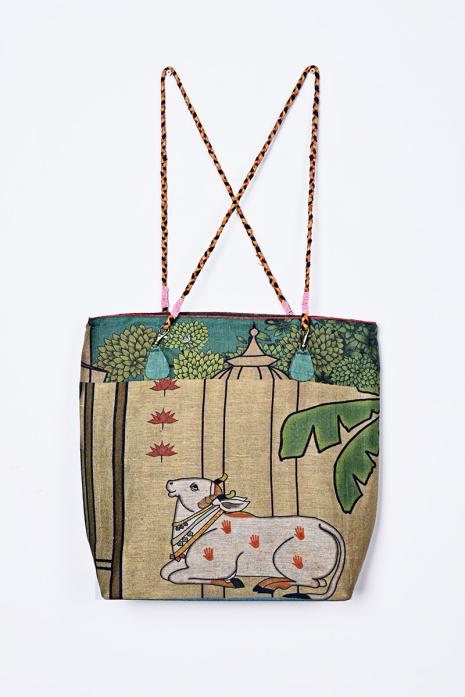 Hand Painted Tote bag inspired by Pichwai art on ghicha silk fabric.
