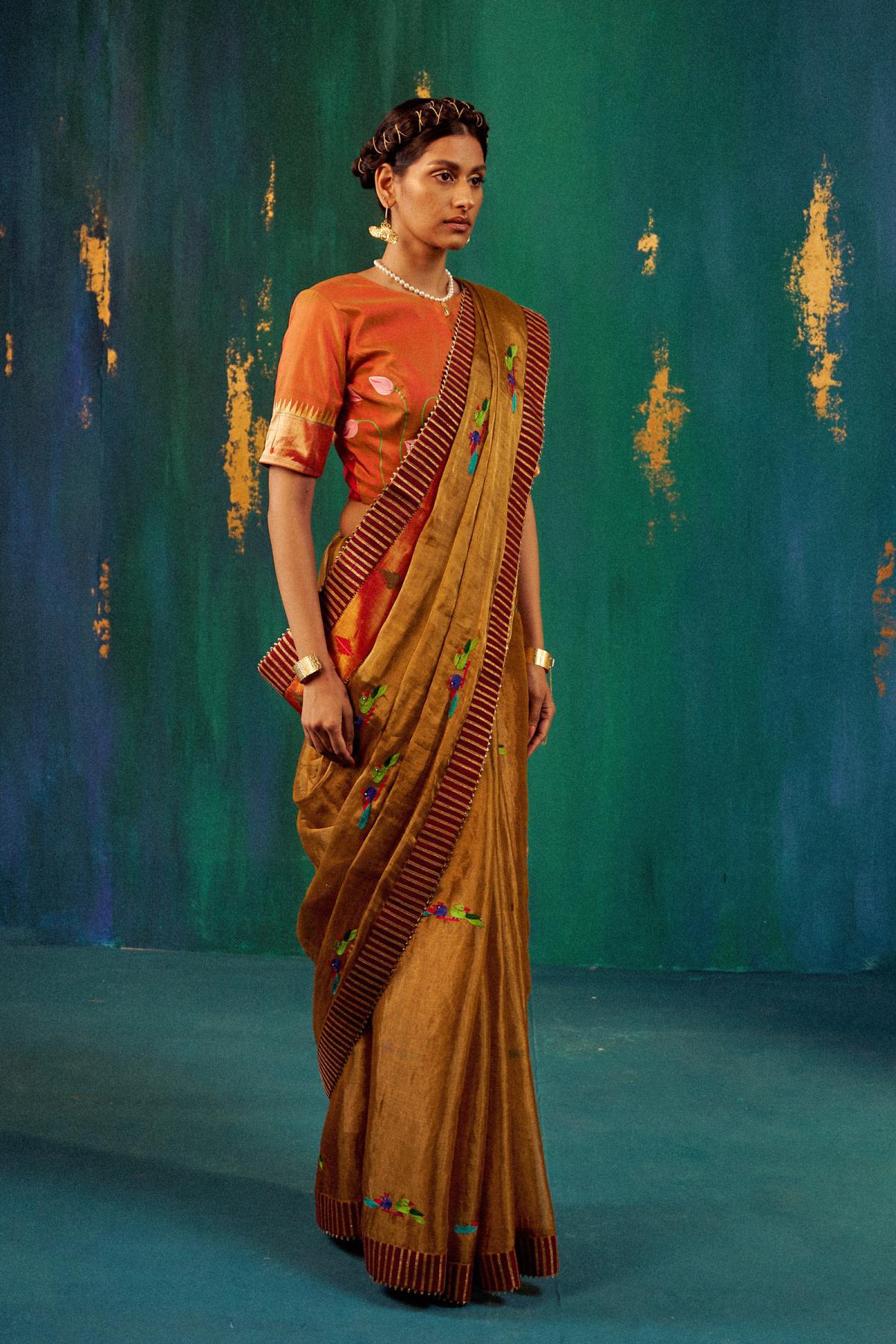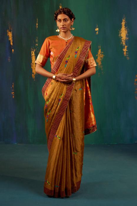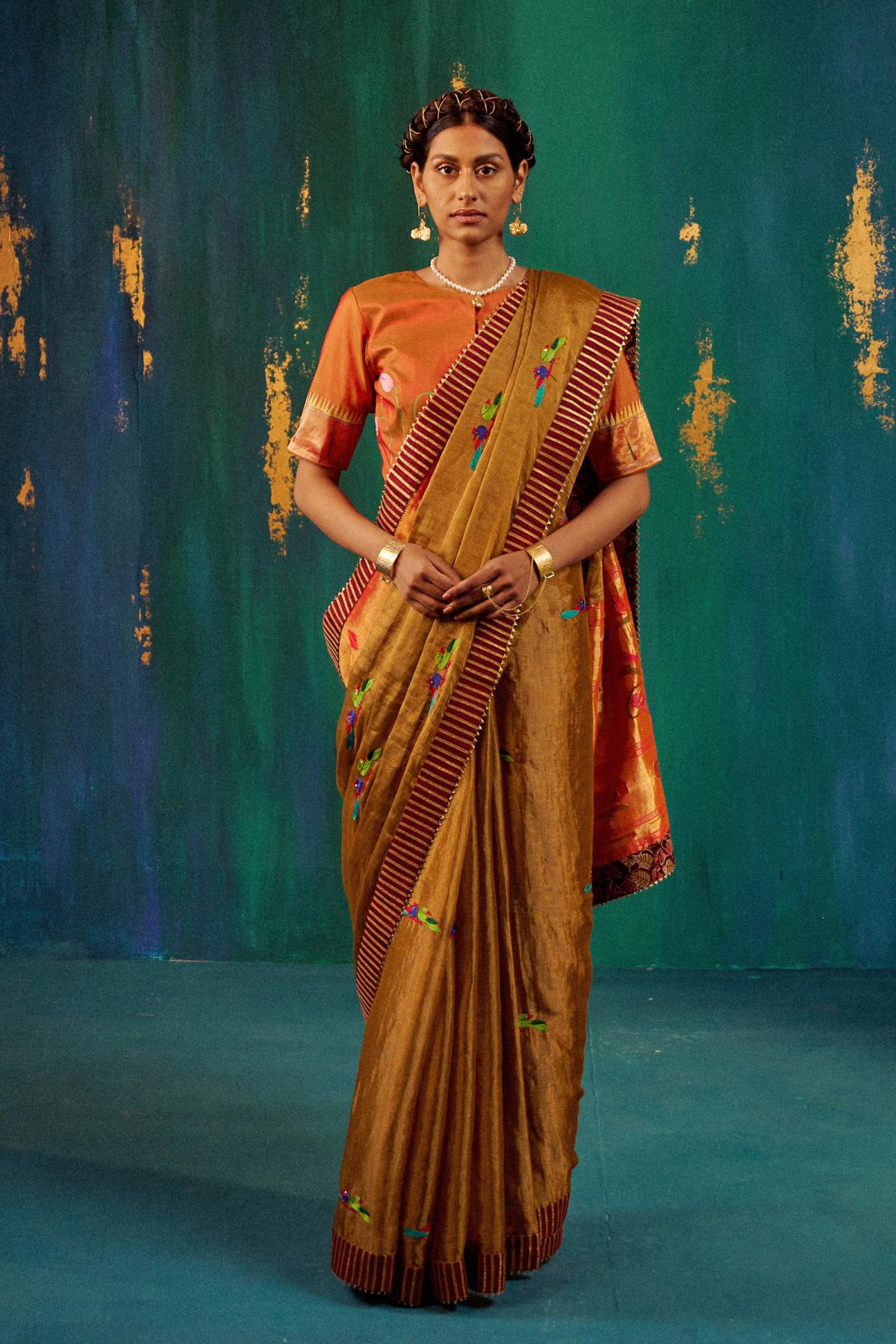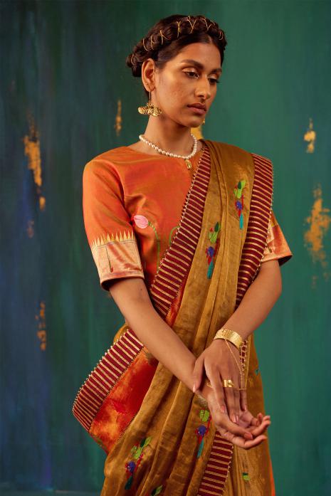 Label Pratham's Pichwai saree is a classic representation of wearable art. It's a fusion creation that blends India's Paithani weave with the interpretive embroidery of craftsmen. This saree is a must-have for any connoisseur of art and craft.