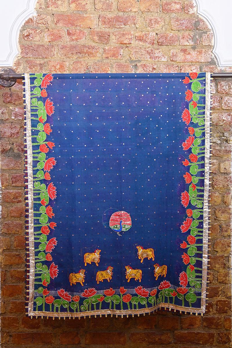 Pichwai Art Inspired Hand Embroidery on Handwoven Organza Dupatta.