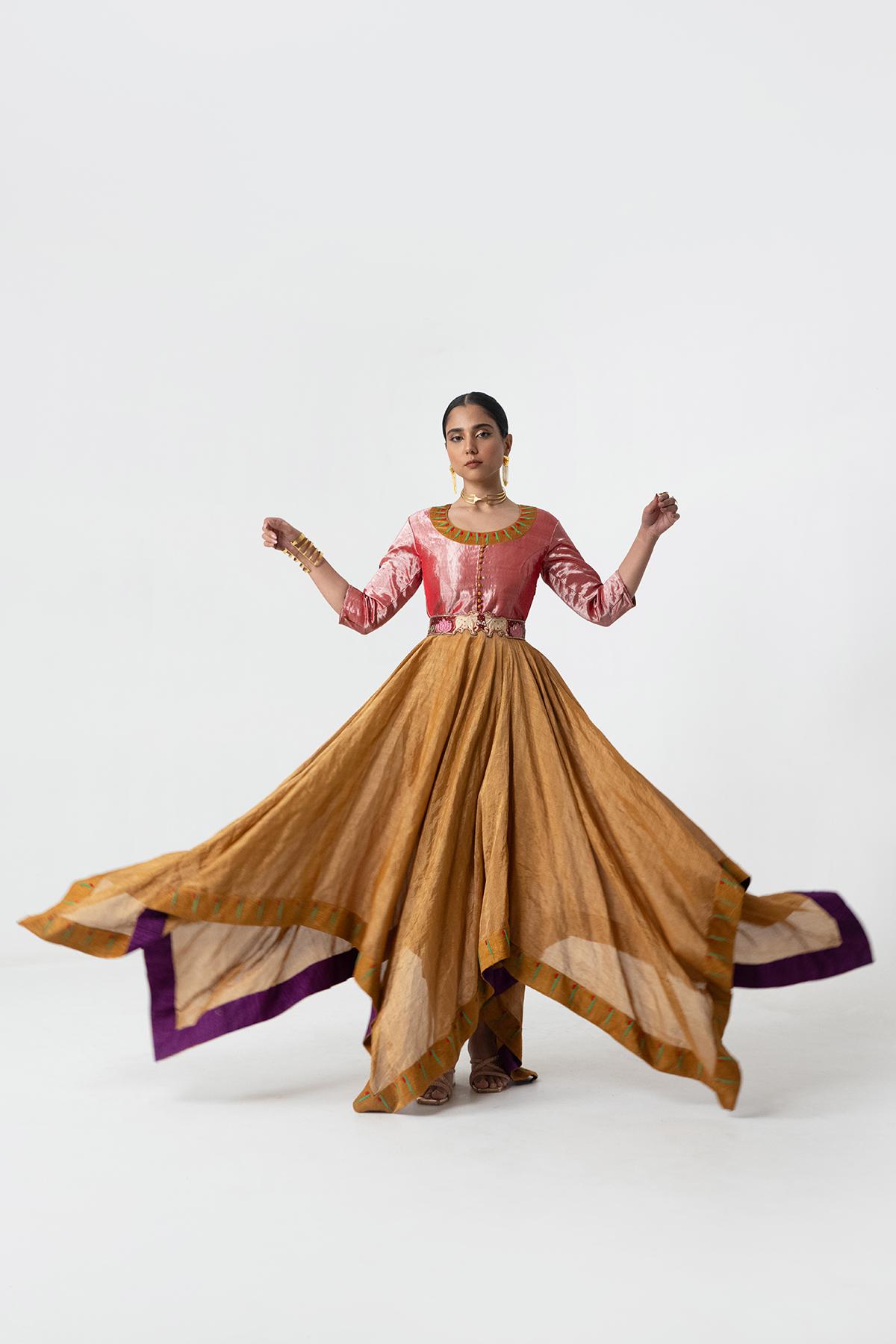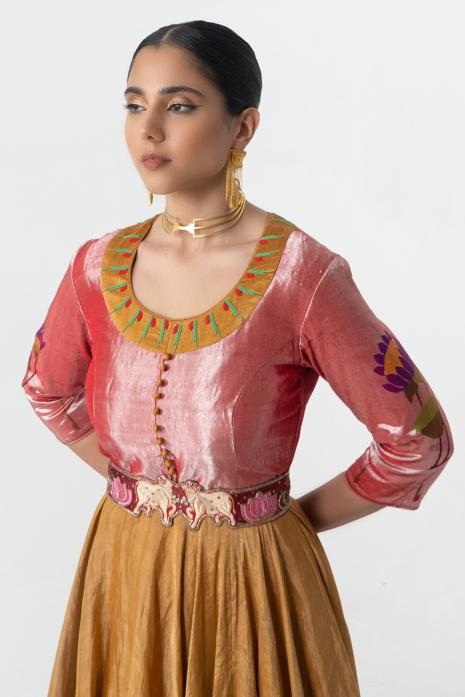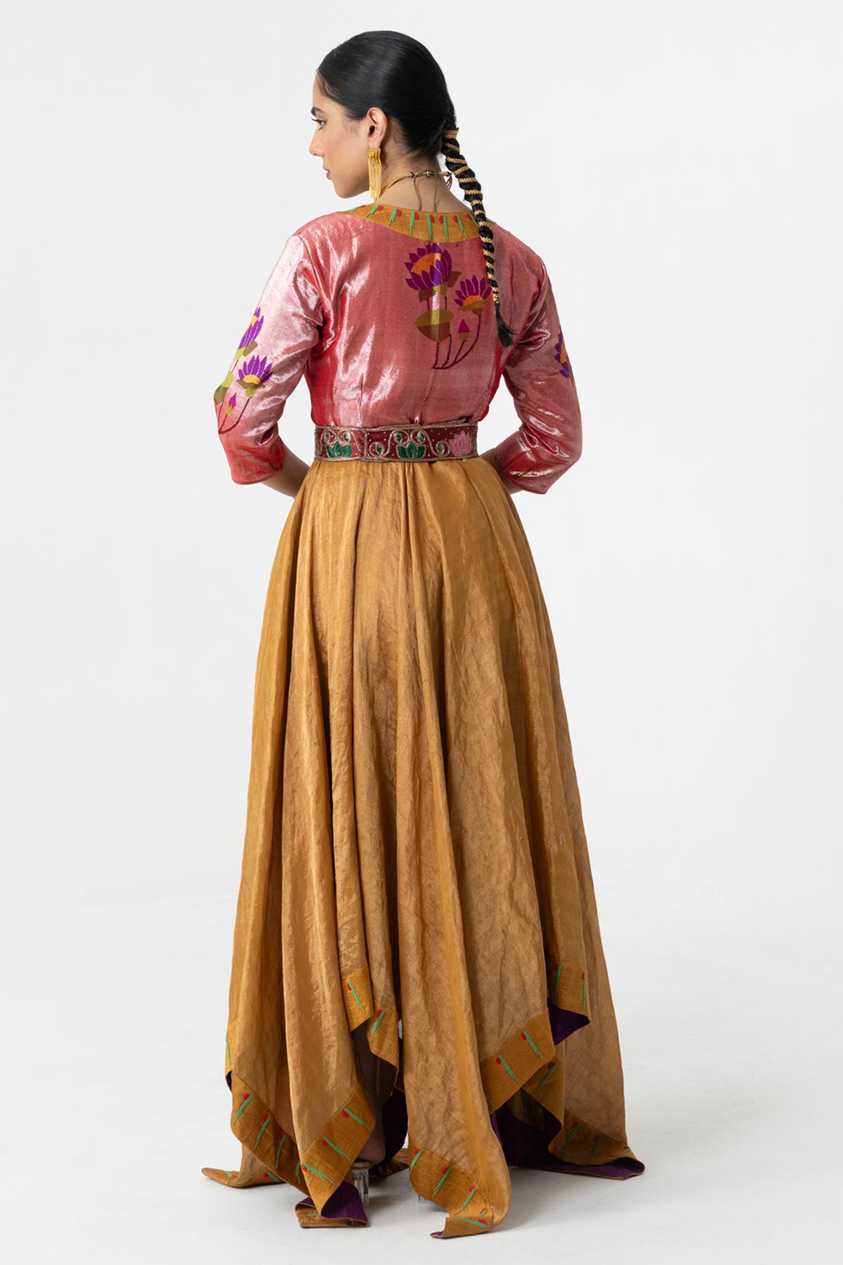 The Label Pratham dress is a chic, contemporary expression of our signature Pichwai drape. It is the perfect choice for the modern Indian woman who likes to merge her classical roots with modern silhouettes. The dress takes our wearable art concept to another level and truly makes handcrafted Pichwai Paithani more inclusive.