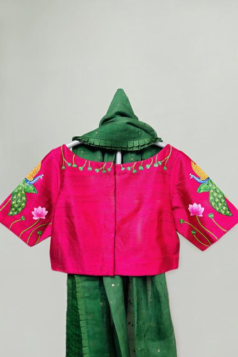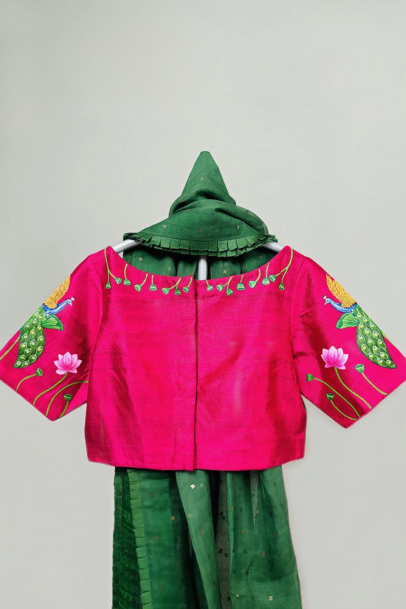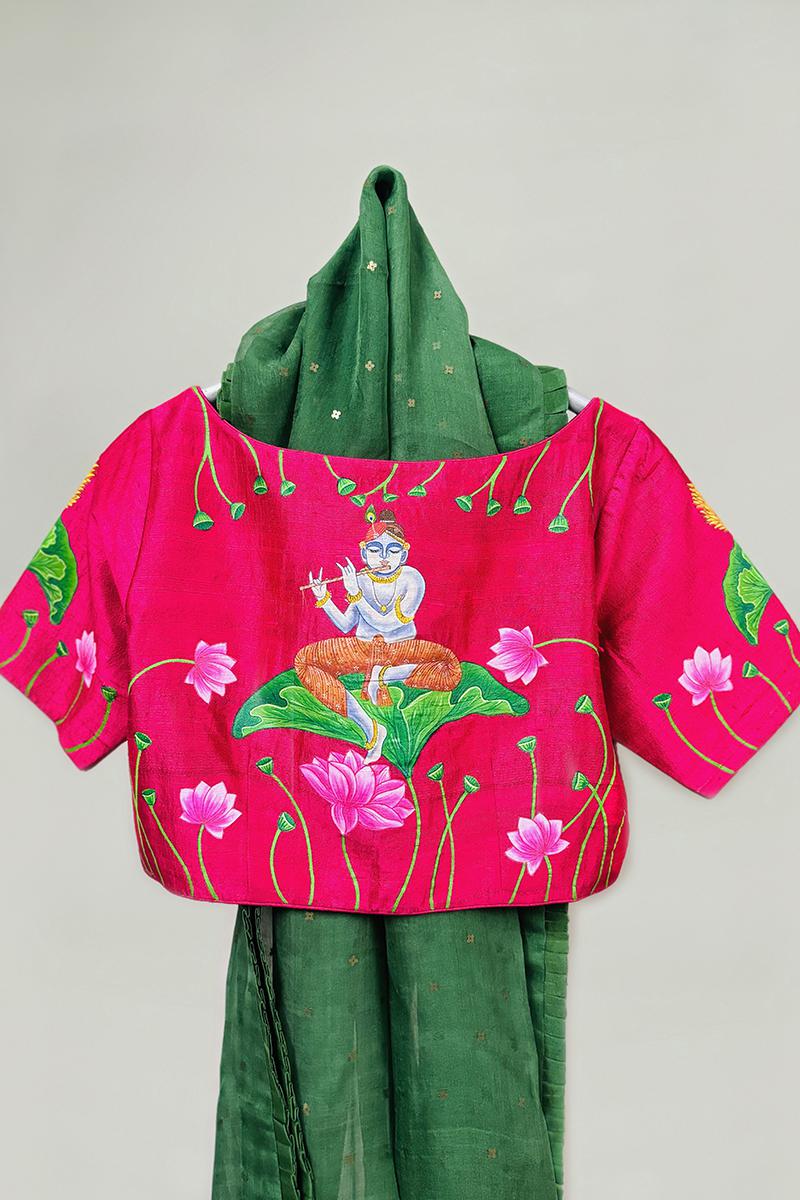 Enrich your wardrobe with the timeless elegance and cultural richness of this stunning handpainted blouse, perfect for adding a touch of sophistication to any occasion. This blouse embodies meticulous craftsmanship, featuring intricate motifs and vibrant hues inspired by traditional Pichwai art.