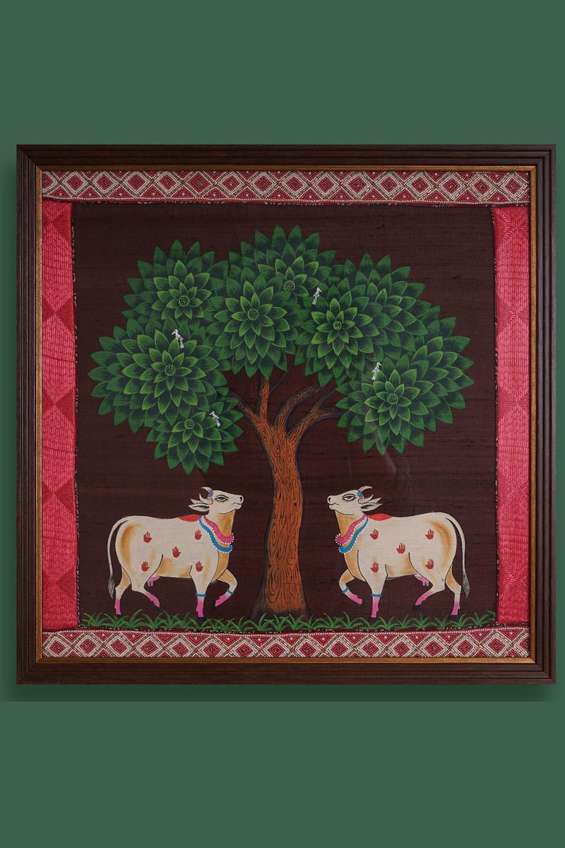 Traditional Pichwai Art Wall Painting on Raw Silk with phulkari & hand embroidered border by Label Pratham