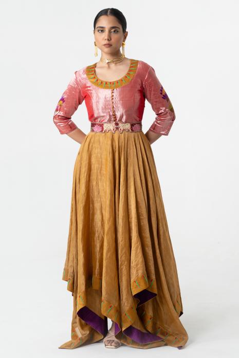 Peach and Mustard Paithani & Chanderi Dress with Belt